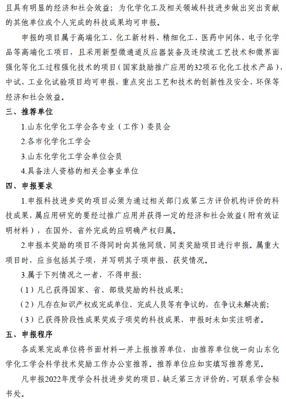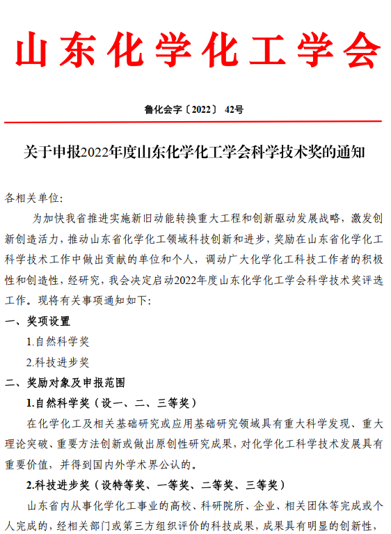 關于申報2022年度山東化學化工學會科學技術獎的通知