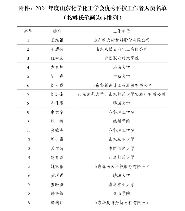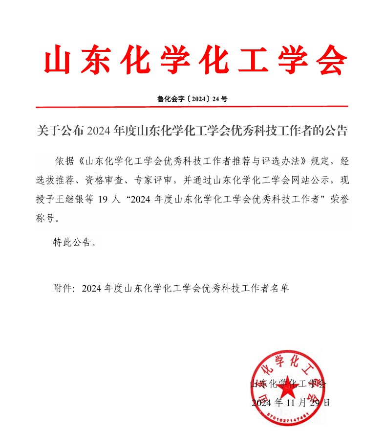關于公布2024年度山東化學化工學會優秀科技工作者的公告