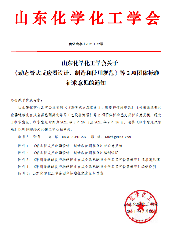 山東化學化工學會關于《 動態管式反應器設計、制造和使用規范 》 等 2 項 團體標準征求意見的通知