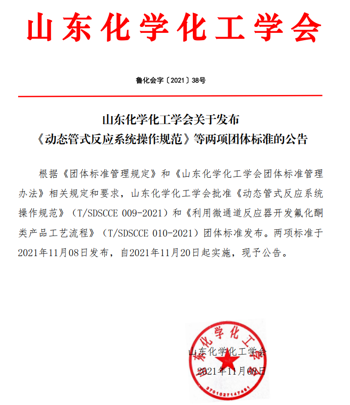 山東化學化工學會關于發布《 動態管式反應系統操作規范》 等兩項團體標準的公告