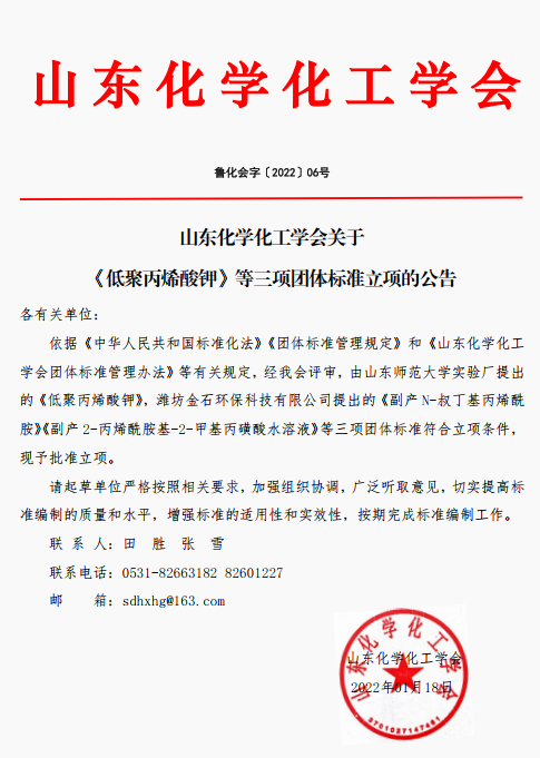 山東化學(xué)化工學(xué)會(huì)關(guān)于《低聚丙烯酸鉀》等三項(xiàng)團(tuán)體標(biāo)準(zhǔn)立項(xiàng)的公告
