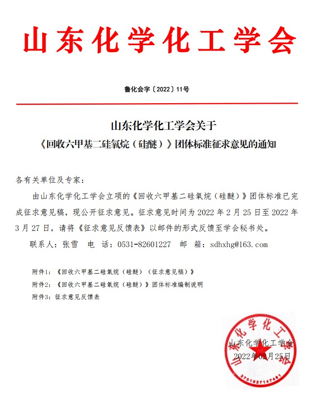 山東化學化工學會關于《回收六甲基二硅氧烷( 硅醚)》團體標準征求意見的通知