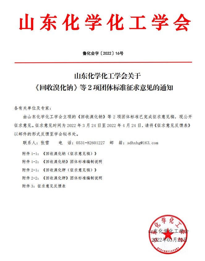 山東化學化工學會關于《回收溴化鈉》等2項團體標準征求意見的通知