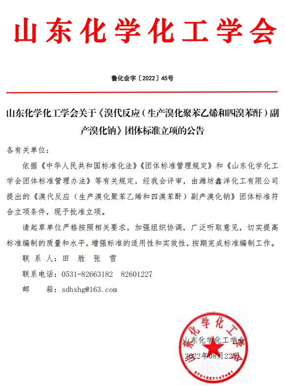 山東化學化工學會關(guān)于《溴代反應(yīng)(生產(chǎn)溴化聚苯乙烯和四溴苯酐)副產(chǎn)溴化鈉》團體標準立項的公告