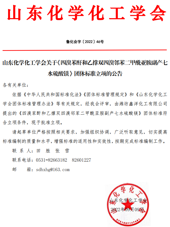 山東化學(xué)化工學(xué)會(huì)關(guān)于《四溴苯酐和乙撐雙四溴鄰苯二甲酰亞胺副產(chǎn)七水硫酸鎂》團(tuán)體標(biāo)準(zhǔn)立項(xiàng)的公告