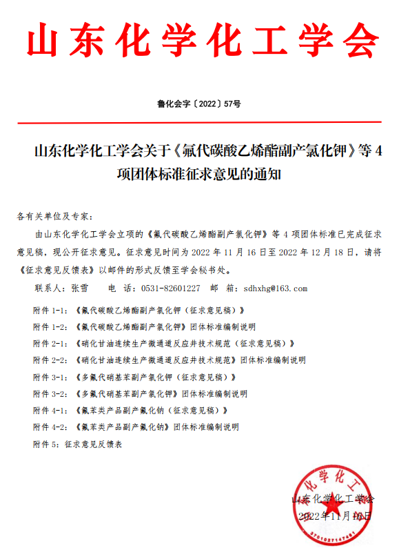 山東化學化工學會關于《氟代碳酸乙烯酯副產氯化鉀》等4項團體標準征求意見的通知