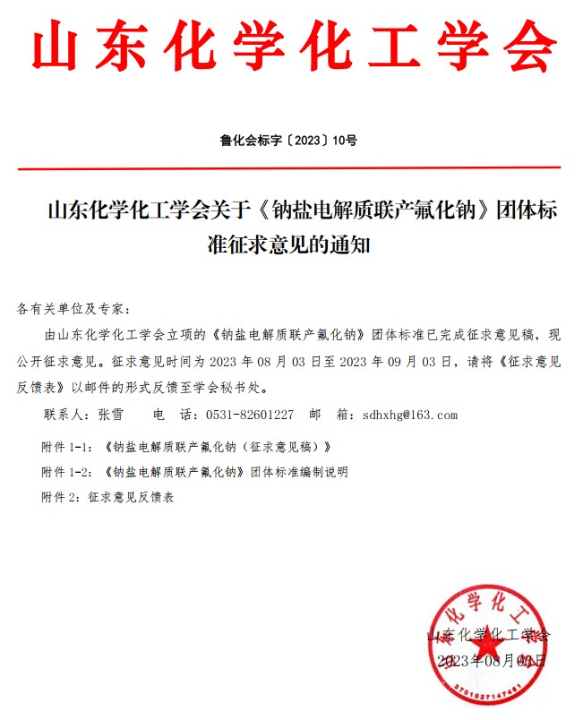 山東化學化工學會關于《鈉鹽電解質聯產氟化鈉》團體標準征求意見的通知