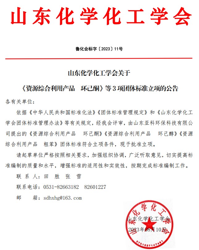 山東化學化工學會關于《資源綜合利用產品 環己酮》等3項團體標準立項的公告
