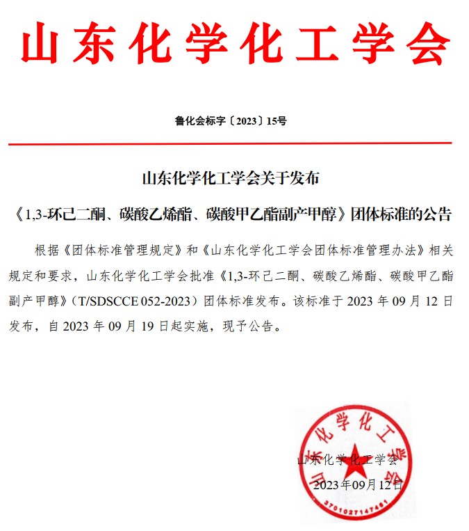山東化學(xué)化工學(xué)會關(guān)于發(fā)布《1,3-環(huán)己二酮、碳酸乙烯酯、碳酸甲乙酯副產(chǎn)甲醇》團(tuán)體標(biāo)準(zhǔn)的公告