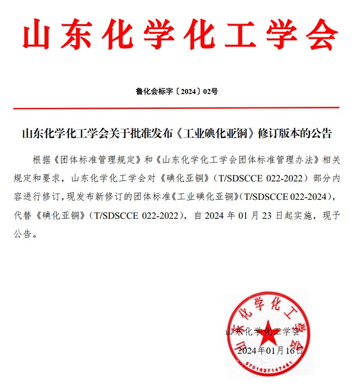 山東化學化工學會關于批準發布《工業碘化亞銅》修訂版本的公告
