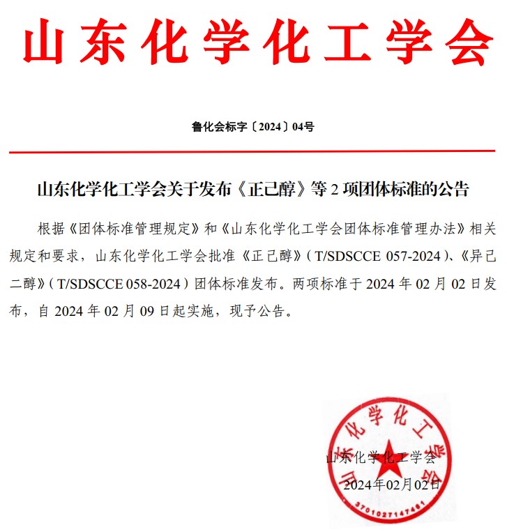 山東化學(xué)化工學(xué)會(huì)關(guān)于發(fā)布《正己醇》等2項(xiàng)團(tuán)體標(biāo)準(zhǔn)的公告