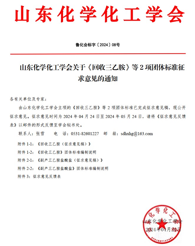 山東化學(xué)化工學(xué)會(huì)關(guān)于《回收三乙胺》等2項(xiàng)團(tuán)體標(biāo)準(zhǔn)征求意見的通知