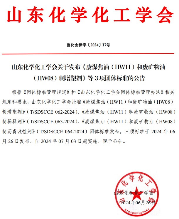 山東化學化工學會關于發布《廢煤焦油(HW11)和廢礦物油(HW08)制增塑劑》等3項團體標準的公告