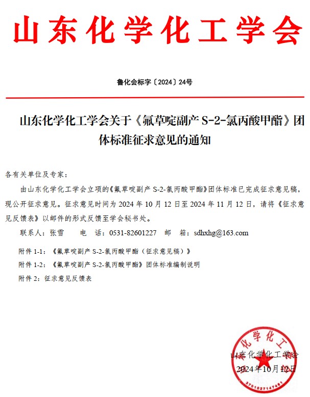 山東化學(xué)化工學(xué)會關(guān)于《氟草啶副產(chǎn)S-2-氯丙酸甲酯》團(tuán)體標(biāo)準(zhǔn)征求意見的通知