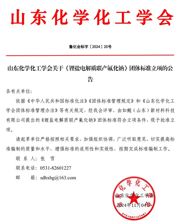 山東化學化工學會關于《鋰鹽電解質聯產氟化鈉》團體標準立項的公告