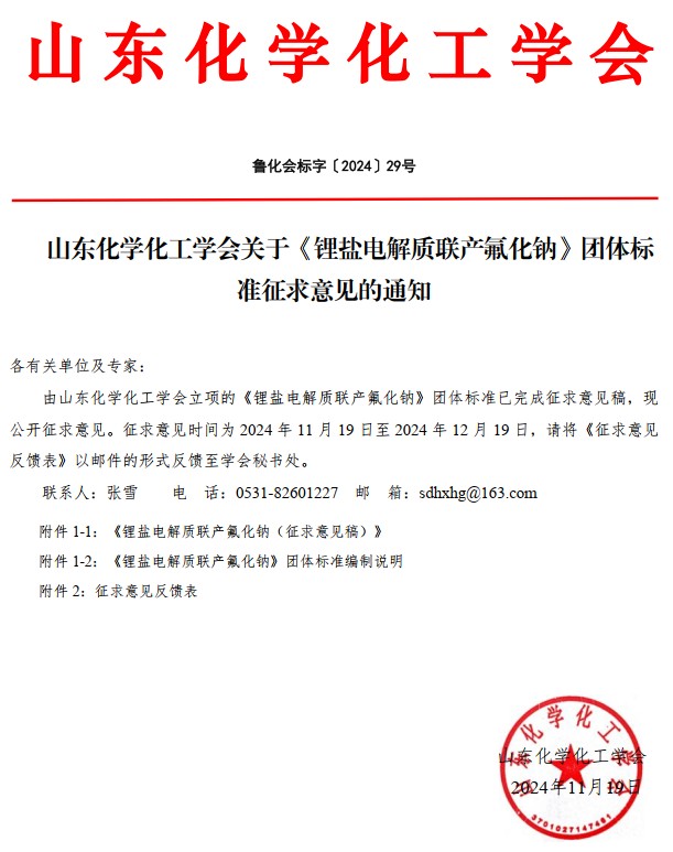 山東化學(xué)化工學(xué)會(huì)關(guān)于《鋰鹽電解質(zhì)聯(lián)產(chǎn)氟化鈉》團(tuán)體標(biāo)準(zhǔn)征求意見(jiàn)的通知