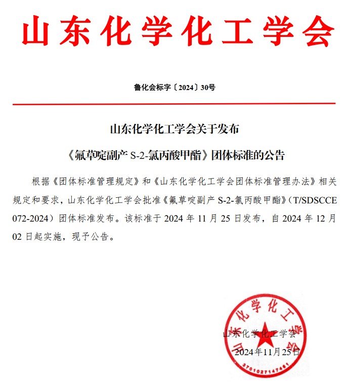 山東化學(xué)化工學(xué)會(huì)關(guān)于發(fā)布《氟草啶副產(chǎn)S-2-氯丙酸甲酯》團(tuán)體標(biāo)準(zhǔn)的公告