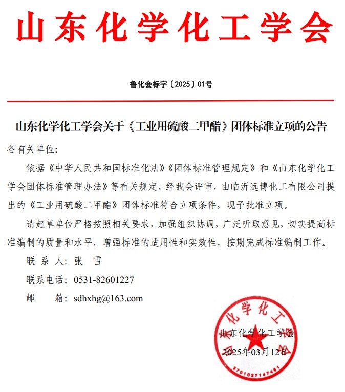 山東化學化工學會關于《工業用硫酸二甲酯》團體標準立項的公告