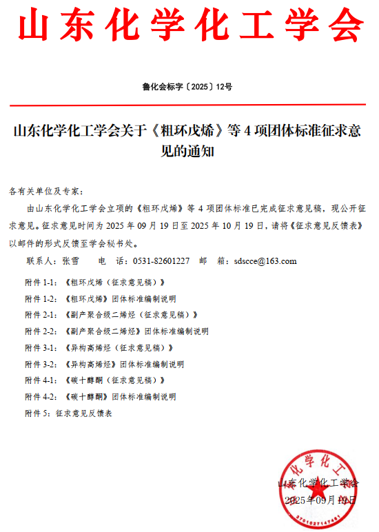 山東化學(xué)化工學(xué)會(huì)關(guān)于《粗環(huán)戊烯》等4項(xiàng)團(tuán)體標(biāo)準(zhǔn)征求意見的通知