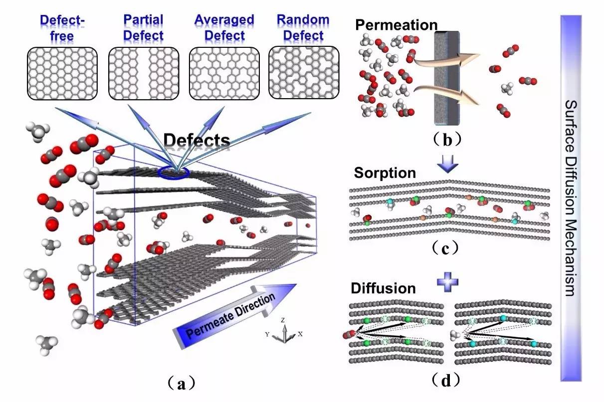 工作亮點:向炭膜微孔中引入不同形式的缺陷,建立了更加接近炭膜孔結構的物理模型,并基于表面擴散機理對混合氣的分離進行分子層面的計算機模擬,通過與實驗結果對比來確定更加合理的微孔缺陷方式,研究工作有較好的創新性。圖為:具有不同缺陷形式的Z字形炭膜微孔模型[圖(a)],炭膜分離CO2/CH4混合氣示意圖[圖(b)],混合氣在炭膜中的競爭吸附現象[圖(c)] ,炭膜孔壁缺陷對氣體擴散的影響[圖(d)]。