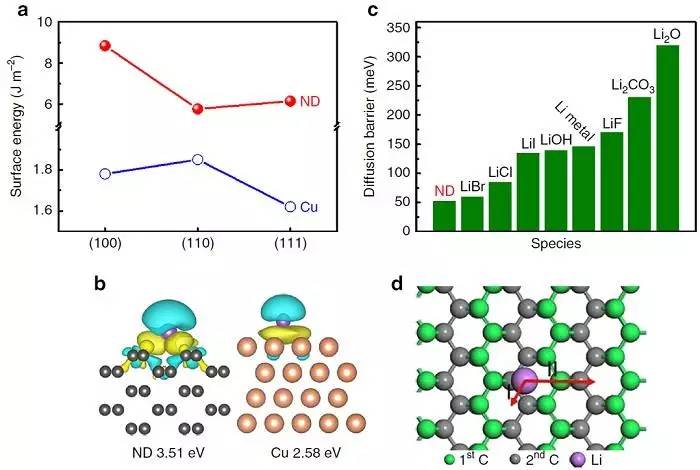 (d) 鋰在納米金剛石(110)表面的最穩(wěn)定的吸收位點和擴散路徑。