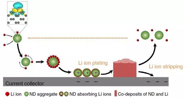 當在電解液中添加少量納米金剛石顆粒時,這些粒子可以在電場和流體的傳送作用下到達負極表面,并均勻分布,成為鋰離子的形核點。納米金剛石與鋰離子具有強吸附作用,這些均勻分布的納米金剛石形核點將會吸附鋰離子在這些點的沉積。由于鋰離子在納米金剛石表面的擴散勢壘很小,鋰離子傾向于在納米金剛石表面均勻沉積。