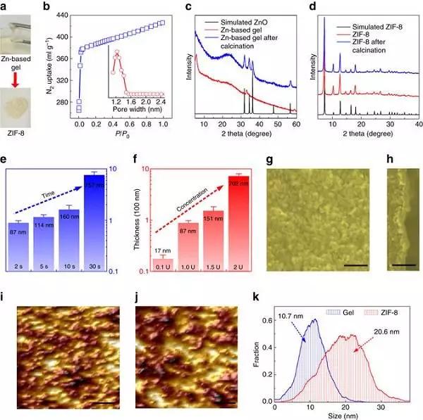 (k)從AFM數據中獲得的Zn基凝膠層和ZIF-8分離膜的晶粒尺寸分布。樣品制備條件:溶膠濃度0.1U、涂膜時間2s、氣相沉積時間2h。