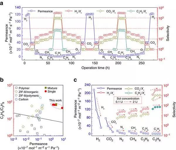 (a)ZIF-8分離膜(制備條件:溶膠濃度1U、涂膜時間2s、氣相沉積時間2h)的單一氣體輸運行為。Xn代表不同的氣體。透過數據是經歷時274h的2個循環收集的,從最小的H2(動力學直徑0.289nm)到最大的C3H8(動力學直徑0.43nm),然后反序;