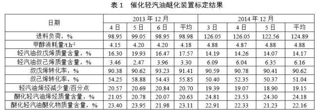 某公司采用LNE-2工藝建成40萬噸/年催化輕汽油醚化裝置,工藝流程簡圖如圖1所示。產品醚化輕汽油作為高辛烷值汽油調合組分。某公司催化輕汽油醚化裝置于2013年11月投產,2013年12月與2014年12月分別對某催化輕汽油醚化裝置進行了2次72小時標定,標定結果如表1所示。