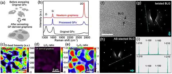 (e) 退火處理后高質量石墨烯薄膜的I2D/IG強度比Mapping圖