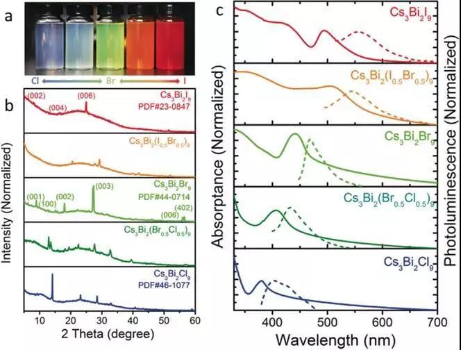 圖3不同鹵素的Cs3Bi2X9(X=Cl,Br,I)鈣鈦礦納米晶