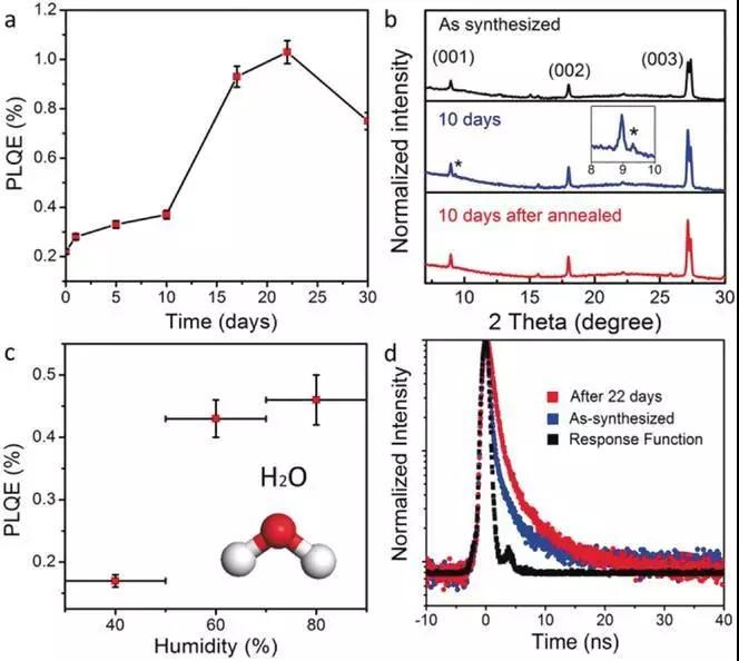 d.新合成Cs3Bi2Br9納米晶和在空氣中存放22天后時(shí)間分辨光譜對(duì)比圖,水分可以鈍化其表面缺陷態(tài)
