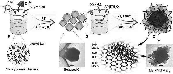 以廉價、穩定、高效的電催化劑替代貴金屬鉑催化劑在大規模清潔能源器件的應用中具有巨大的潛力。金屬有機框架(MOFs)和金屬硫化物(MDs)由于其超高表面積、分層孔隙結構和高催化活性,為高活性電催化劑的設計提供了廣闊的平臺。武漢理工大學木士春教授(通訊作者)等制備了基于MoS2納米片垂直包覆具有界面 Mo–N偶合中心的Mo–N/C框架的復合電催化劑。上述復合材料在析氫反應(HER)、析氧反應(OER)以及氧還原反應(ORR)中表現出良好的電催化活性和穩定性,是一種多功能電催化劑。有趣的是,該電催化劑作為鋅-空氣電池的陰極也展示出較高的性能。優異的電化學活性應歸因于不同的化學成分之間的協同效應、獨特的三相活躍位點以及分層孔隙框架帶來的快速質量運輸。該工作有望為設計用于電化學能源器件的領先高效MOF/MD基復合電催化劑提供啟發。