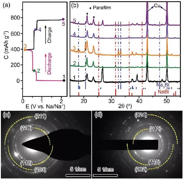 (c)放電至0.1V的Bi電極的SAED圖案。