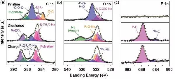 在NaPF6-G2電解液中的原始狀態,放電和充電的Bi電極的C1s(a),O1s(b)和F1s(c)光譜。
