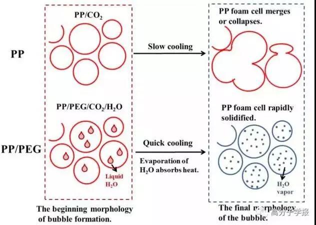 基于上述背景,中國科學院長春應用化學研究所唐濤研究員課題組在《高分子學報》2017年第12期發表的快報中以二氧化碳物理發泡制備PP泡沫的模壓工藝為例,將少量聚乙二醇(PEG)加入到PP中形成共混物(PP/PEG),使PP體系具有吸水性。其中,PP共混物中吸附的水在發泡過程中可以同時起到助發泡劑和原位冷卻劑的作用,進而實現對泡沫定型階段的控制。