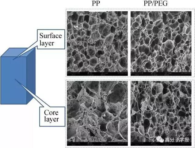 (圖二 PP泡沫和PP/PEG泡沫表層和芯部泡沫的SEM照片)