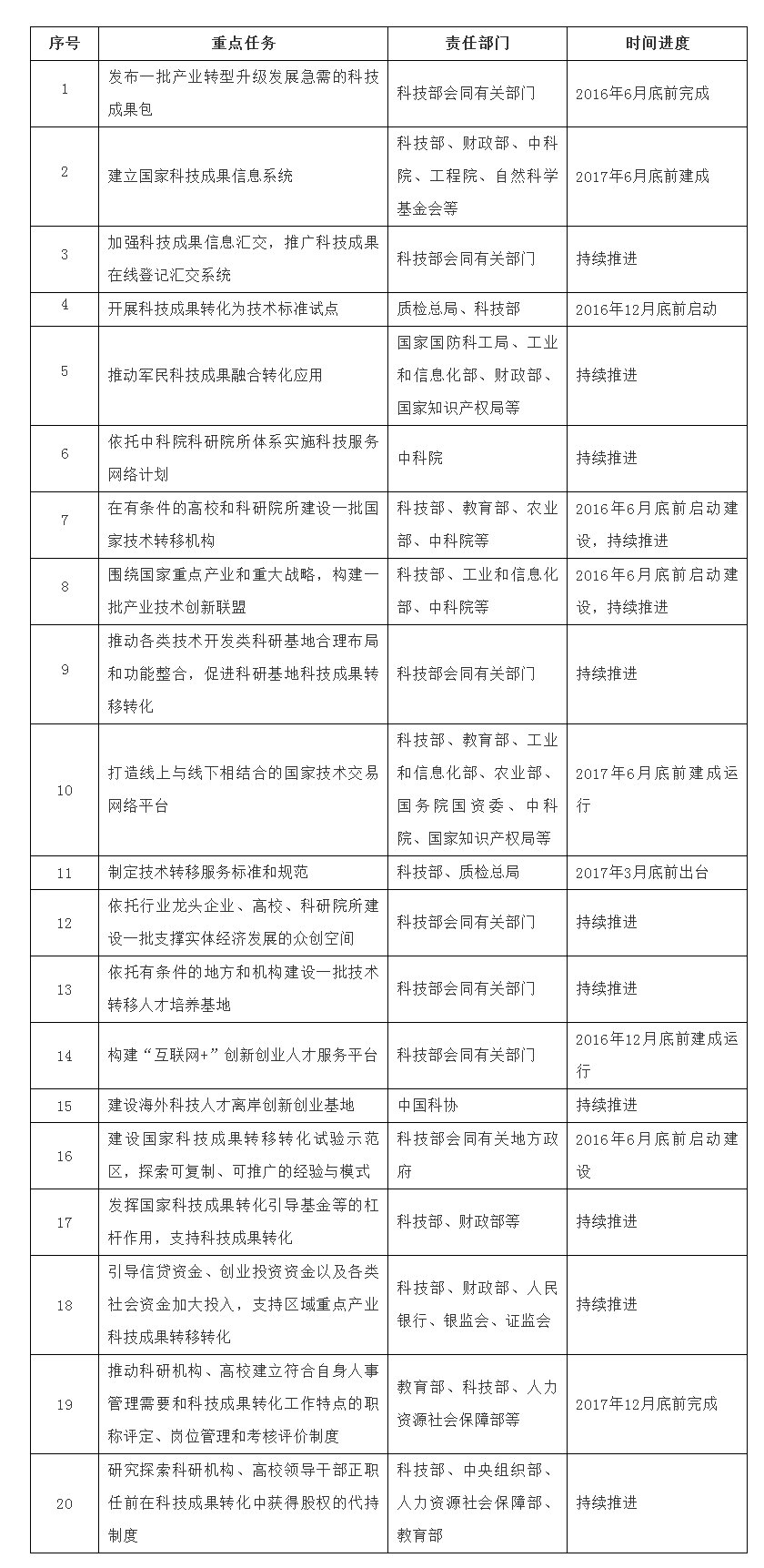 (三)加強(qiáng)示范引導(dǎo)。加強(qiáng)對(duì)試點(diǎn)示范工作的指導(dǎo)推動(dòng),交流各地方各部門(mén)的好經(jīng)驗(yàn)、好做法,對(duì)可復(fù)制、可推廣的經(jīng)驗(yàn)和模式及時(shí)總結(jié)推廣,發(fā)揮促進(jìn)科技成果轉(zhuǎn)移轉(zhuǎn)化行動(dòng)的帶動(dòng)作用,引導(dǎo)全社會(huì)關(guān)心和支持科技成果轉(zhuǎn)移轉(zhuǎn)化,營(yíng)造有利于科技成果轉(zhuǎn)移轉(zhuǎn)化的良好社會(huì)氛圍。 附件:重點(diǎn)任務(wù)分工及進(jìn)度安排表