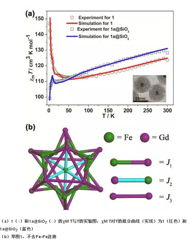 理解復雜團簇體系中的磁交換作用對指導團簇磁性材料的設計與合成至關重要,而目前單分散團簇的磁交換作用的實驗與理論研究非常少。該課題組制備了目前報道的最高核稀土-鐵氧團簇Gd12Fe14,并利用反相微乳法成功制備了單分散團簇Gd12Fe14@SiO2的核殼結(jié)構(gòu)。實驗與理論研究表明,SiO2層的包覆不但有效消除了團簇間的磁相互作用,而且增加了外圍Fe3+離子的磁零場分裂值,同時降低了整個團簇分子的磁各項異性。該研究為人們理解單分散金屬團簇分子的磁交換作用提供了新的認識。