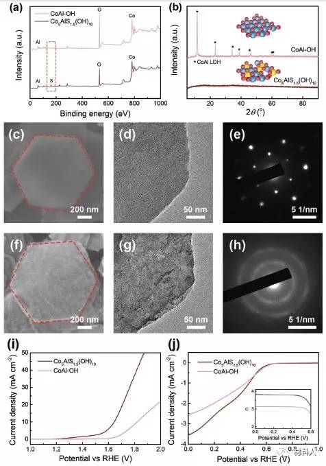 圖一:CoAl-OH和Co5AlS1.5(OH)10樣品結構表征和電催化性能測試