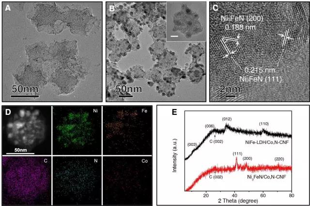 (A) 前驅(qū)體NiFe-LDH/Co,N-CNF的TEM圖;