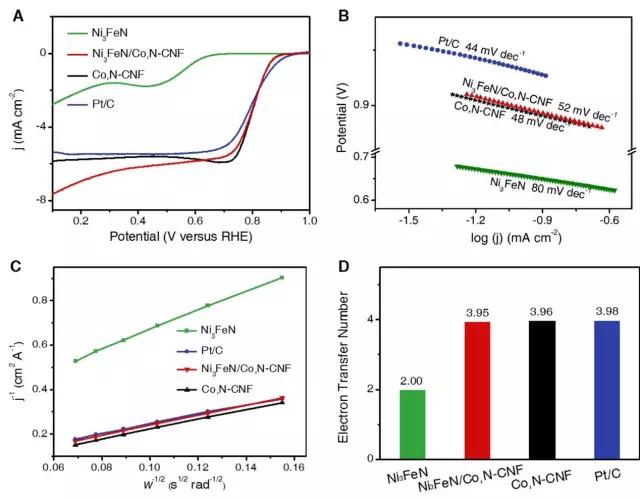 研究人員利用Co,N-CNF優(yōu)異的ORR性能和穩(wěn)定負(fù)載物效應(yīng),成功地緩解了Ni3FeN的團(tuán)聚問題,得到14 nm Ni3FeN負(fù)載Co,N-CNF雙功能催化劑,并可高效、穩(wěn)定地應(yīng)用于可逆鋅空氣電池中。該策略為高活性、多功能(OER, HER, ORR)催化劑的合成提供了思路,可廣泛應(yīng)用于金屬空氣電池、可充放電式燃料電池、全分解水以及其他能源領(lǐng)域。