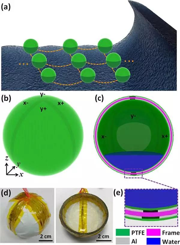 該團隊為收集水波能量構建一種高度對稱的三維球形水基摩擦納米發電機。該發電機的內外壁均可以收集水能,提高了傳統摩擦納米發電機的轉化效率。由于內壁疏水性材料的選擇,即使水滲入發電機的內部,也不會使發電機失效,這增加了發電機的服役周期。同時可以將單個的三維球形水基摩擦納米發電機集成化,構建發電機網,為未來打造水波能量農場提供了可行途徑。因此,這種獨特結構的納米發電機為未來大范圍水能收集奠定了堅實的基礎。