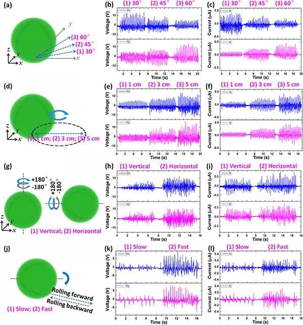 (l) 球形水基摩擦納米發電機快速和緩慢滾動時的電流輸出。