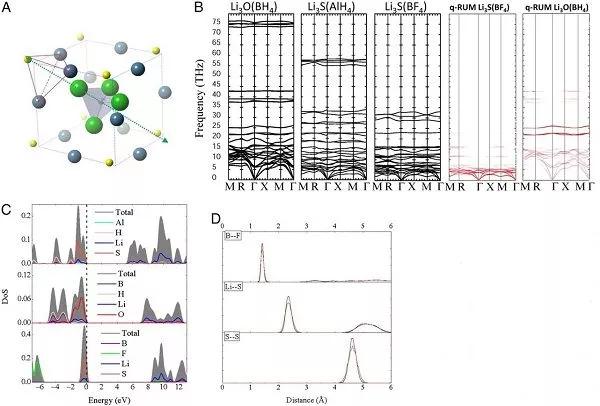 B. 晶體Li3OBH4,Li3SAlH4以及Li3SBF4的晶格動力學性質比較,聲子譜中的紅色振動模都屬于準剛體模(quasirigid unit modes);