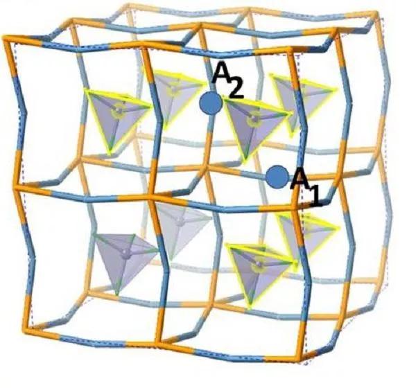 圖2中藍色圓圈表示了鋰離子,每個鋰離子有4個團簇離子(黃色加亮的四面體)作為近鄰。這些團簇離子的平移與轉動振動模不斷改變鋰離子感受到的勢平面,促使鋰離子在固體中的遷移(如從A1位置到A2位置)。