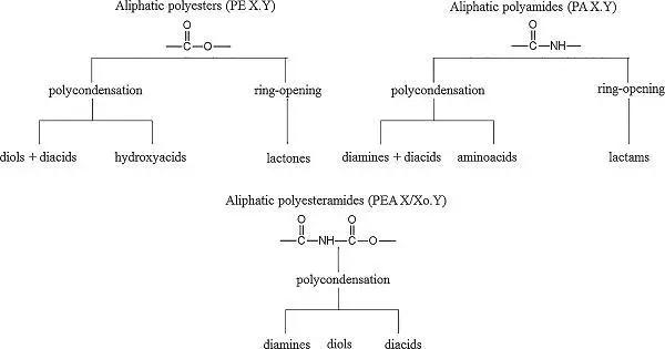 圖5 脂肪族聚酯、聚酰胺和聚酰胺酯的合成方法和底物