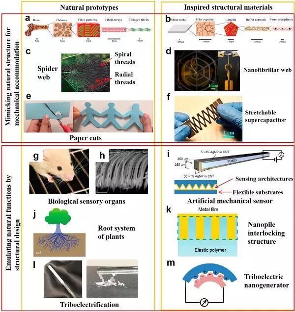 在過去的二十年中,柔性電子器件領(lǐng)域已取得令人興奮的進步,有望在未來人類生活中引發(fā)一場革命。然而,由于在復雜應(yīng)力環(huán)境中活性材料較差的可持續(xù)性,構(gòu)建柔性器件已有了新的需求。因此,通過自然選擇發(fā)展出各種環(huán)境適應(yīng)性結(jié)構(gòu)和材料的天然材料分級體系結(jié)構(gòu)可啟發(fā)研究人員解決材料和工程技術(shù)的局限性。南洋理工大學陳曉東教授(通訊作者)等綜述了受天然材料啟發(fā)的結(jié)構(gòu)材料智能設(shè)計及其在構(gòu)筑柔性器件中的應(yīng)用。作者首先總結(jié)了能適應(yīng)機械變形的結(jié)構(gòu)材料,適應(yīng)機械變形是柔性器件能在復雜的環(huán)境中正常工作最基本的要求。之后,作者討論了受自然啟發(fā)的結(jié)構(gòu)材料的柔性器件的功能,包括機械傳感、能量采集、身體互動等等。最后,作者為開發(fā)新結(jié)構(gòu)材料及其在未來柔性器件中的潛在應(yīng)用以及仿生功能的前瞻策略提供了一種思路。