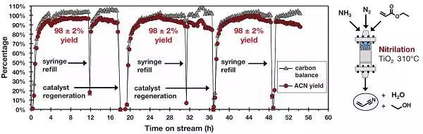 北京時間2017年12月8日,Science在線發表了美國可再生能源國家實驗室Gregg T. Beckham(通訊作者)團隊題為“Renewable acrylonitrile production”的文章,該團隊提出了一種使用3-羥基丙酸(3-HP)生產可再生ACN的新方法,所述3-羥基丙酸(3-HP)可由糖微生物產生。該方法通過用廉價的二氧化鈦固體酸催化劑脫水和氨氮化從3-羥基丙酸乙酯(乙基3-HP)獲得超過90%的ACN摩爾收率。隨后,該團隊進一步闡釋了一個基于這種化學反應的大規模集成工藝,可以實現丙烯酸乙酯近乎定量的ACN產率(98±2%)。這種吸熱方法消除了反應過程中失控的危險,并且比標準丙烯氨氧化方法獲得更高的產率,既避免氰化氫作為副產品同時也提高了工藝安全性并減少了產品處理要求。