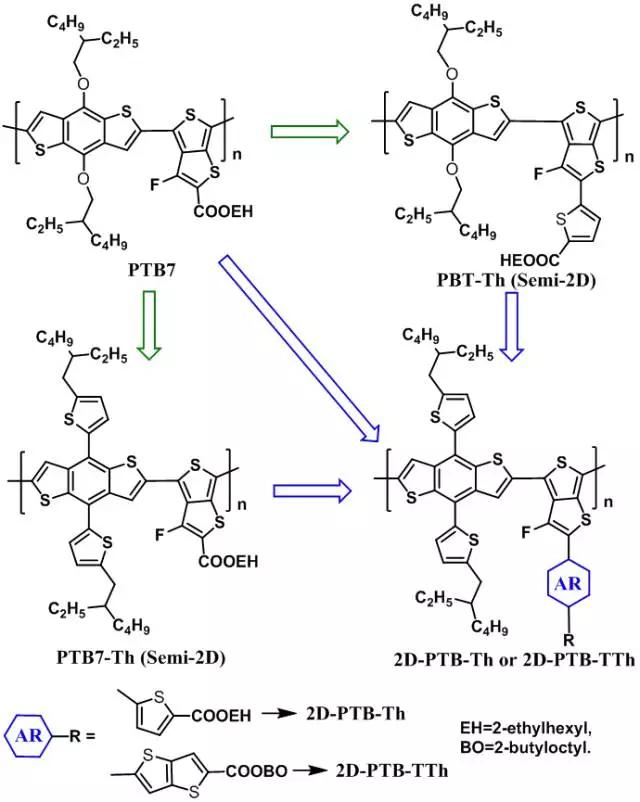 圖1. 全二維共軛結構設計思路以及聚合物2D-PTB-Th和2D-PTB-TTh的化學結構式